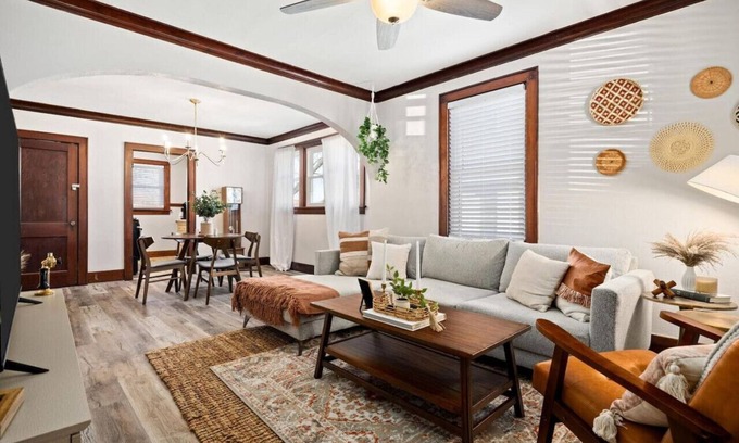 Welcome to our enchanting 2-bedroom Mid-Century Bohemian retreat in the heart of Peoria Heights, where vintage charm meets modern luxury. Nestled conveniently next to the famous Trefzger's Bakery, this stylish haven promises a unique blend of comfort and character.