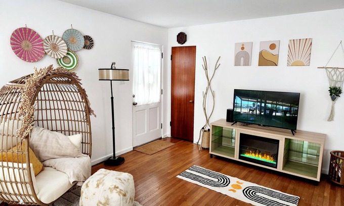 Mid century + boho getaway on a quiet road in Godfrey 2BR, 1 BA WiFi included is located in Godfrey. Mid century + boho getaway on a quiet road in Godfrey 2BR, 1 BA WiFi included provides accommodation, featuring Bedding/Linens, Wellness Facilities, Fireplace/Heating, among other amenities. This House features Bedding/Linens, Wellness Facilities, Fireplace/Heating, to make your stay a comfortable one.