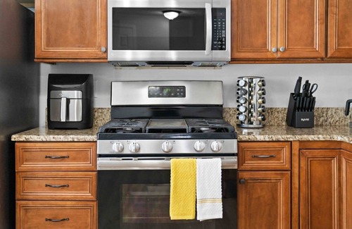 The stainless-steel appliances in the fully equipped kitchen make it a joy to prepare meals, and there's a laundry room in the basement, complete with a washer and dryer for your convenience. The kitchen is stocked with trash bags, dishwasher pods, dish soap, and Starbucks coffee pods. We provide laundry detergent and an ironing board, so you can pack light and always look your best.