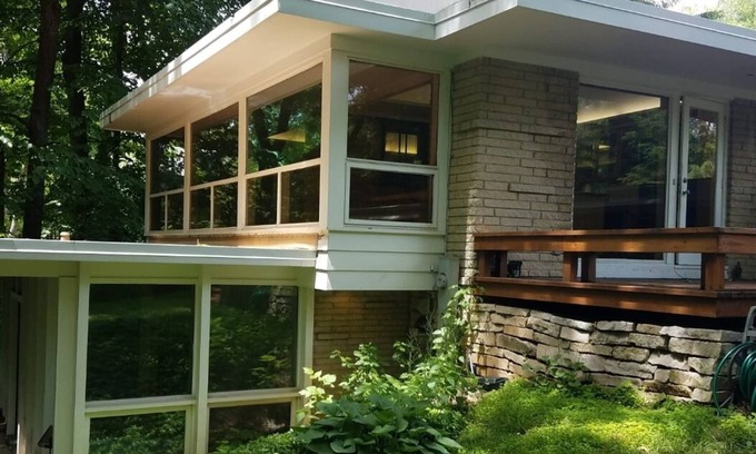 The Home is an Iconic Mid Century Modern house designed by John Randal McDonald a follower of Frank Lloyd Wright. The house is a 3 level structure located in a natural ravine in a wooded setting with wrapped around glass walls and natural brick stone walls.
