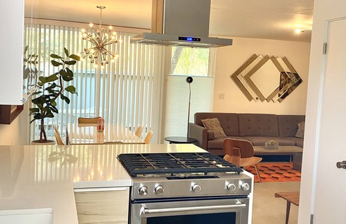 An architecturally significant gem in the desert. Mid Century Modern architecture by famed Barry Berkus as featured on the Modernism 2020, 2022 & 2024 tours and published in Melissa and Jim Riche’s Mod Mirage: The Mid Century Architecture of Rancho Mirage book. Nestled against the mountains surrounding Magnesia Falls Cove, yet walking distance to dining, shopping and entertainment. Lush gardens surround this 2 bedroom 2 bath unit, fully renovated with modern conveniences, yet retaining its Midcentury charm. Furnished with a mix of Mid Century and modern pieces. The kitchen features high end appliances and is fully stocked for your cooking adventures. There are 2 furnished outdoor patios, one off the dining area with BBQ and another off the Master Bedroom and Kitchen to fully enjoy the beautiful outdoors. The roomy master bedroom includes a king bed, 40” Roku TV, bathroom as well as a small work station. The 2nd bedroom has a queen bed, and also includes a work area. Wireless high speed internet available throughout the unit - great for your Flexcation. A nice comfy sectional offers a place to read, relax and watch your favorite shows. Unwind by the pool and Jacuzzi under unimaginably tall swaying palm trees.