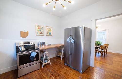 This cozy cottage is dressed to the nines with midcentury flair! Vintage art and décor are paired with modern appliances and comfy furniture. You'll stay in a safe and quiet family neighborhood, two blocks from coffee, restaurants, and vintage shopping in adorable downtown Tipp City. Upstairs, there's a queen bed and two twins. Downstairs, a sleeper sofa converts to a full-size bed.