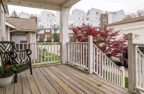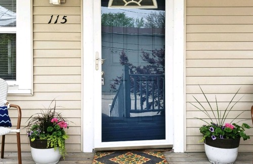 Very private street surrounded by new condos and lofts- but a large private yard, front and back covered porches. Walk to town, Uber, drive, or bus station is one block away.