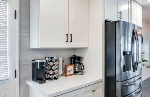 This home has a Smart TV, Full Kitchen: Refrigerator, Stove, Sink, Microwave, Coffee Pot, Cooking Ware, Plates, Cups & Utensils, Complimentary Washer, Dryer, and detergent is also provided.
