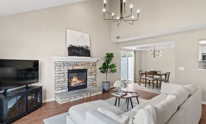 Enjoy this tastefully designed mid-century modern villa! This home features 2 bedrooms plus den/loft space and 2.5 baths. When you walk in, you're greeted with a beautiful and grand living room with vaulted ceilings. This home is located in a quiet subdivision adjacent to a walking trail and Soloman Farm. In the summer time, there's a beautiful colorful flower field just steps away from the villa. Near the end of summer, it switches to a sunflower field! Just mins away from ample of retail stores, Starbucks, grocery stores, restaurants, Parkview and Dupont Hospital. Approx 15 mins away from downtown Fort Wayne!