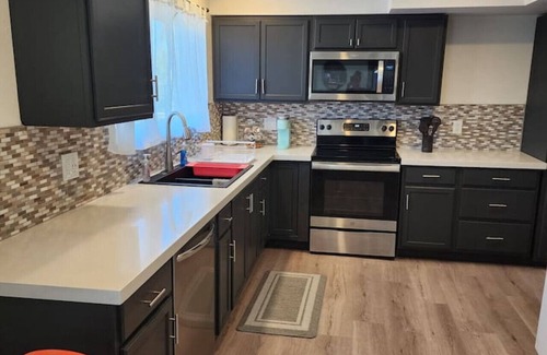 This is an 1,100 sq. ft first floor home. There is an upper unit which was converted into a 1 bedroom apartment for my son, but currently is being rented out as a short term rental. There is a private separate entry to the left side of the home. There is a fireplace with remote controlled candles. There is a master room with a king size bed and 2nd bedroom with a queen size bed.