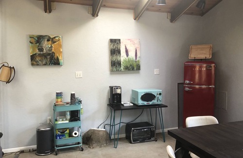 The kitchenette has a microwave, toaster, Keurig coffee maker and a toaster oven/air-fryer. Just outside the kitchenette door is an outdoor cooking area with a sink with hot and cold potable water and a bbq with a side burner. We provide pots, pans, cooking utensils, and basic oils and spices.