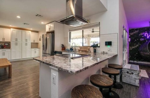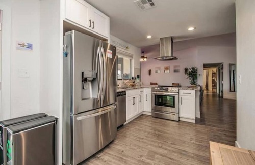 Looking for the ideal space for your family, multi-family or friends trip?! Look no further! We welcome you, upon entry, to "vacay mode" - enjoy a swing in our hanging egg chair next to our faux live wall. Our home sleeps up to 16 people (on actual beds, no pull-out couches) on brand new hybrid mattresses. The backyard is perfect for the kiddos and kids at heart! Enjoy our private heated pool, mural, yard games (Cornhole, Jenga, Twister Splash, Giant Connect Four), loungers, gas Blackstone BBQ, & help yourself to fresh lemons from the lemon tree. Escape the direct sun to our covered outdoor patio with dual ceiling fans, comfy sectional seating w/ gas firepit, & enjoy watching all the sports on the outdoor TV. To accommodate small children, we provide a pack 'n' play, high chair, step stool, potty training seat, changing pad, children's books, lots of board games and kids dishware. Bringing the dog? Our vacation home is dog friendly (with an added fee), & we provide dog bowls and a dog bed.