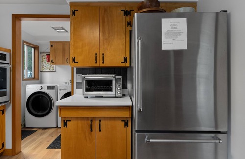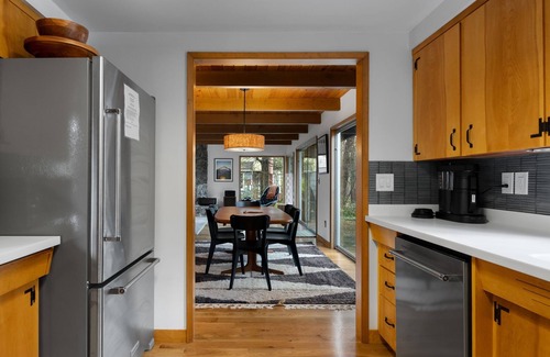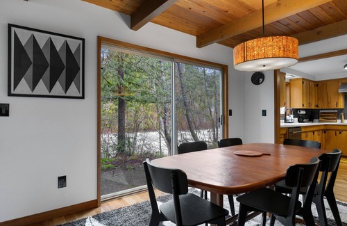 Discover the perfect riverside retreat in this stunning 3-bedroom, 2-bathroom mid-century modern home, nestled in the woods of Mt. Hood just outside Portland. Designed for both relaxation and adventure, this architectural gem blends clean lines and warm, natural elements with breathtaking river views. Floor-to-ceiling windows flood the open-concept living space with natural light, seamlessly connecting the indoors to the surrounding forest.