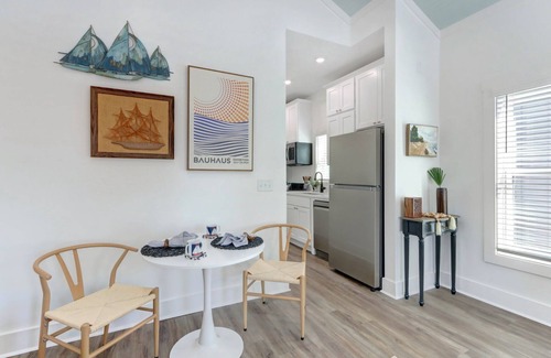 This brand-new cottage exudes a playful and whimsical atmosphere, perfect for a fun-filled vacation. Its open and bright interior is situated within a charming enclave of seven cottages and two flats, all nestled in the coastal, pedestrian-friendly neighborhood of Thunderbolt, Georgia. This cottage features all of the modern conveniences one could ask for - smart TV's, a full kitchen equipped with all essentials needed for home cooked meals, luxurious spa-like bathrooms, large closets and a plush bed.