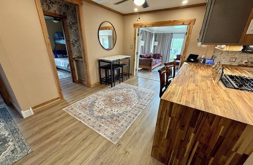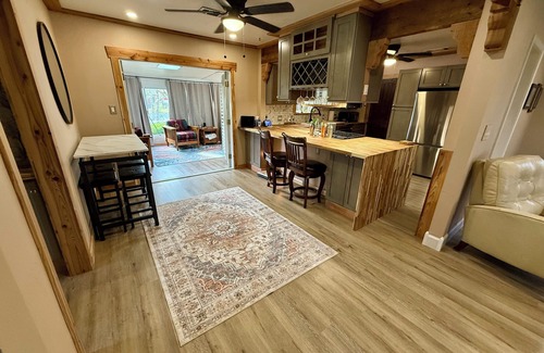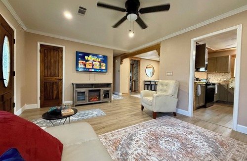 This newly remodeled Tulsa Midtown Cottage boasts 2 inviting bedrooms, 2 living areas and a completely remodeled kitchen/dining area. The bedrooms provide a new king bed and TV in one room while the 2nd provides a double / twin bunk with twin trundle, also with its own TV. The comfortable living room has all new leather furniture with a power recliner, flowing into the open dining room. The 55-inch 4k Fire Television in the living area has all your streaming services and guest Wi-Fi is available for your devices. The Kitchen has all new butcher block countertops and new bespoke appliances with a gas-convection oven and stove, a large microwave, dishwasher refrigerator/freezer, and a Krieg coffee maker with provided coffee pods to get you going in the mornings. For the Cooks, a full assortment of pots, pans, serving ware, and place settings for six. The all-new bathroom is equipped with a large tiled shower, a large bowl sink on butcherblock counter, with towels, wash cloths, shampoo and soaps, and a hair dryer for your convenience. From the dining room through the double french doors is the Sunroom, furnished with Amish Loomis Mission Indian Blanket furniture, providing a secondary living space with an additional 55”-inch 4k Fire TV. The sunroom overlooks the large stone patio that is furnished with an outdoor dining table and 4 chairs, love seat sofa and love seat glide. Also provided is a wood-burning chimnea and a propane-assist charcoal grill. The yard is fenced and ready to enjoy with your dog(s). Full-size washer and dryer are available, located within the Sunroom for easy access. Enjoy the terrific and serene atmosphere of this perfect getaway with 7 min drive to Expo Square, 10 min drive to BOK Center, 11 min drive to the Gathering Place in the heart of Riverpark. Within 5-minute distance is a Walmart neighborhood store, Walgreens, Natrual Grocers, Braums, Umberto’s Pizza, Tims Midtown Diner, Saffron Mediterranean Cuisine, Albert G BBQ, Bird & Bottle, Subway, Wendy’s, and many other shops. We look forward to hosting you at our place.