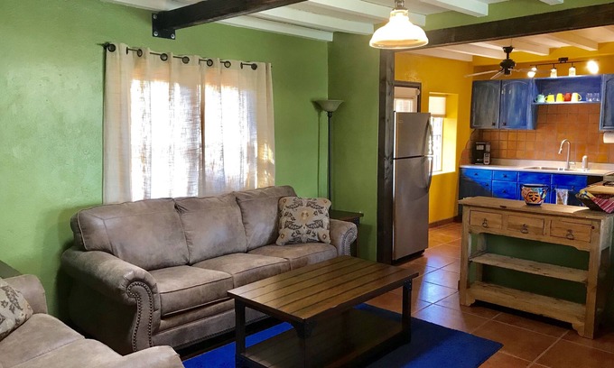 Historic 1946 adobe home with vibrant Mexican style colors and decor. Guests have the entire property. Modern amenities includes ductless ac/heat, WiFi, and full kitchen with new appliances. California king bed and two twin beds all w/ memory foam. TV in both bedrooms and living room. All smart TVs with Netflix and Amazon Prime. Only the living room TV has local channels. Games and DVD’s provided. Unique Outdoor bathroom IS the second bathroom. Main bathroom has a walk-in travertine shower and travertine sink.