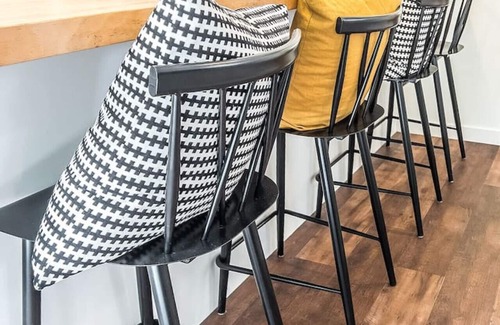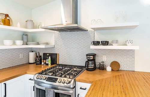 The kitchen and living room are open concept allowing for cooking, eating, and movie watching all at the same time. The kitchen is fully stocked with large and small appliances including a gas stove, dinnerware, kids utensils and dishware, and the essentials for creating meals from home! Salt, pepper, olive oil, and coffee are provided. Seating for 4 is at the stylish butcher block countertops and open to the living room.