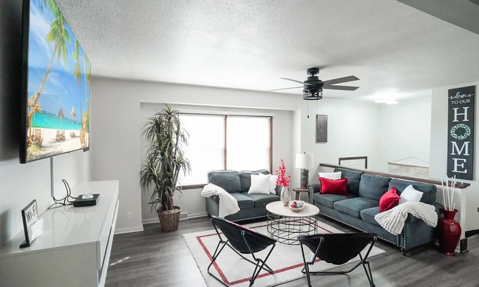 This family friendly home comes complete with a King bed Master Suite, plus plenty of rooms and beds for your big family or group! Searching for the perfect home base with the perfect blend of relaxation and convenience? Enjoy a fully-equipped kitchen, high-speed Wi-Fi, two cozy living spaces! Located just 5 minutes from Zona Rosa and 10 minutes from KCI Airport, with easy highway access for exploring KC. 20 minutes from many landmarks like Power and Light, Worlds of Fun, Sporting KC and Arrowhead stadium! Perfect for families, groups, or business travelers.