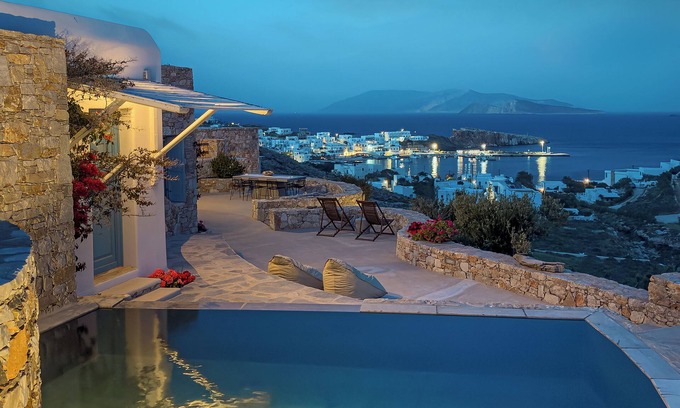 Best-rates for the Mikros Vorias Folegandros starts from $1,003 per night with includes Parking, TV, Balcony/Terrace, Oceanfront, Bedding/Linens, Internet, Laundry, Air Conditioner, Wellness Facilities, Barbecue/Outdoor Cooking, Child Friendly, Pool, View, Security/Safety, Entertainment, Kitchen, Private Pool, Ocean View with all other amenities. Perfect for Weddings is committed to ensuring every guest experiences a comfortable and extraordinary stay, whether planning a romantic getaway, a honeymoon, a pet-friendly stay, or celebrating with the entire wedding party.