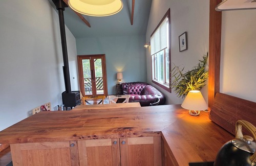 The Mill House is a captivating cottage with two inviting bedrooms, each furnished with a luxurious king-size bed and a private door leading to the verandah. The spacious bathroom is a sanctuary with a deep soaking bath, a separate shower, and a handcrafted Coachwood vanity made from timber sourced on the property. The heart of the home is an expansive open-plan living space with a cozy fireplace. The stunning kitchen, also crafted from locally harvested Coachwood, is a chef's dream. An expansive timber deck extends the living space outdoors, complete with a plush daybed for ultimate relaxation.