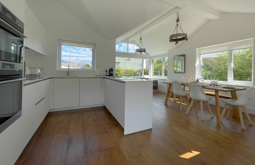 Off the entertainment space is the large kitchen diner. The kitchen has been newly fitted with clean, white marble worktops which gives it a modern feeling. The high-vaulted ceilings add to the feelings of space and the large windows to the rear of the room allow you to take in the beautiful garden and the fells beyond and the door allows access to the garden. The kitchen consists of a fridge/ freezer, oven and electric hob, dishwasher, kettle and toaster. There is also a pod coffee machine for your use during your stay. The kitchen also has plenty of storage for your belongings and a breakfast bar that sits 3 people. The dining table can sit 6 comfortably