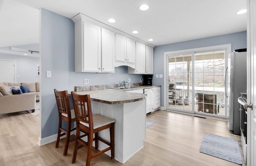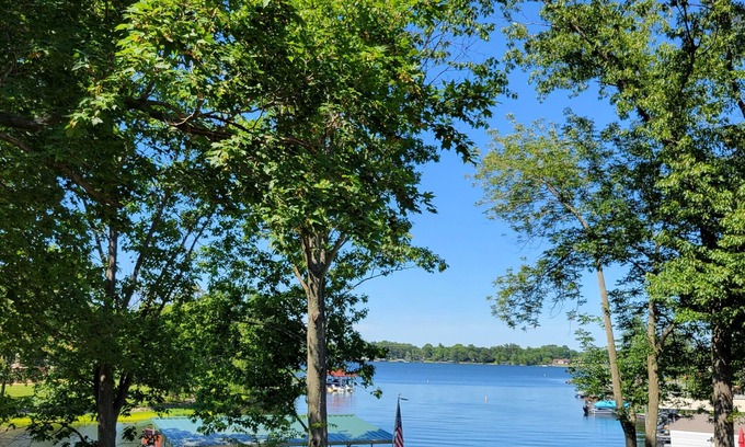 Great patio view overlooking the lake. Easy walk to the boat dock and sun deck. 3 bedrooms 3 bathrooms. Master bathroom has tub only. No shower. Fully furnished kitchen. Ready to walk in and enjoy your vacation. No wake zone area with deep water. fire pit on the property. it does not have any wood so bring your own. the patio does have a gas grill and outdoor table and chairs. you may want to bring something to float on. kayaks available at no charge. 10 person pontoon boat is available to rent and will be at the dock. 10 life vests for adults only. boat and kyaks are seasonal. Dish TV service. internet code is in the book