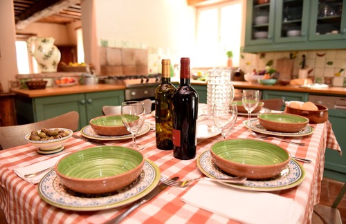 INTERIOR: The house is decorated with antiques and Oriental rugs: the emphasis is on stylish comfort. There are terracotta floors and high wood-beamed ceilings. The spacious kitchen is the house's focal point: the raised fireplace is perfect for an autumn evening. Our housekeeper will always put a smile on your face with her gracious hospitality. She is happy to cook delicious country meals for guests upon request.