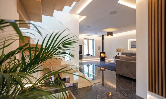 Amenities: Central heating. Electric double oven and hob, microwave, fridge/freezer, dishwasher. 1 x TV with Sky and Netflix, 1 x TV, WiFi. Fuel and power inc. in rent. Bed linen and towels inc. in rent. Highchair and cot available. Off-road parking for 4 cars. Enclosed rear garden with patio, lawn and furniture, first-floor terrace with decking, lawn, furniture, fire pit and hot tub. Gas BBQ. One well-behaved dog welcome. Sorry, no smoking. Shop 0.1 miles, pub 0.2 miles. Note: Strictly no stag or hen parties, or anything similar. All members of mixed groups need to over age 25