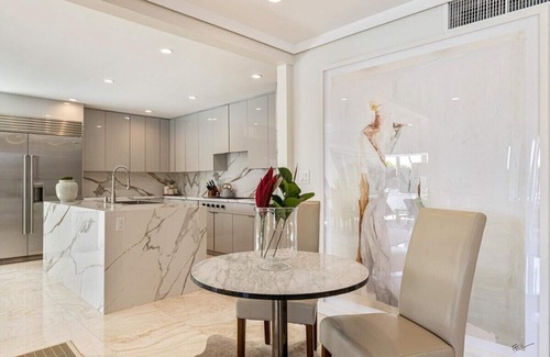 The foyer opens to a bright and airy great room designed with modern furnishings. Large glass sliders open directly onto the patio for seamless indoor/outdoor living. This space is ideal for entertaining with ample seating and a wet bar fully equipped with a wine refrigerator and high-top bar seating. Adjacent is the gourmet chef's kitchen with top-of-the-line Sub-Zero and Wolf appliances, double ovens, a gas range, an ice machine, and open workspaces. Serve up a meal at the adjoining formal dining area or dine alfresco next to the pool.