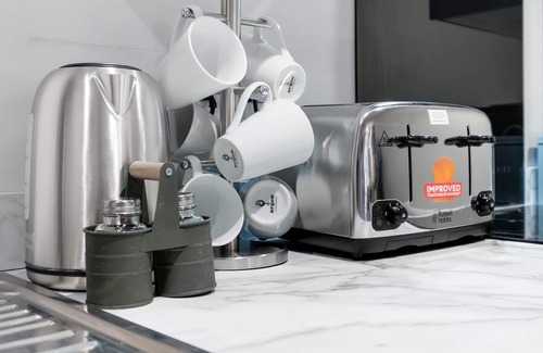 The serviced apartment in Milton Keynes has a well-equipped kitchen, featuring an electric kettle, toaster, microwave, fridge, hob, and electric fan oven. Guests will find all the necessary kitchenware, utensils, pots, pans, cutlery, crockery, and glasses for a comfortable stay.
