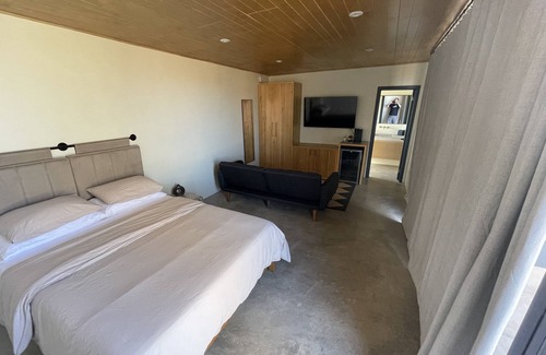 EXPERIENCE: At Casas MILU you will enjoy a private open living/bedroom space, that is filled with natural light. The views continue into the bathroom, with large windows and endless views of the unique landscape. You can relax in your private fire pit, and enjoy a glass of wine, from a curated selection. Our outdoor communal area is perfect for an intimate dinner, weekend cookouts, or even small private events. The outdoor kitchen, sitting area, and large TV are sure to satisfy any group gathering. Additionally, we provide assistance with planning of private dinners and wine tastings.