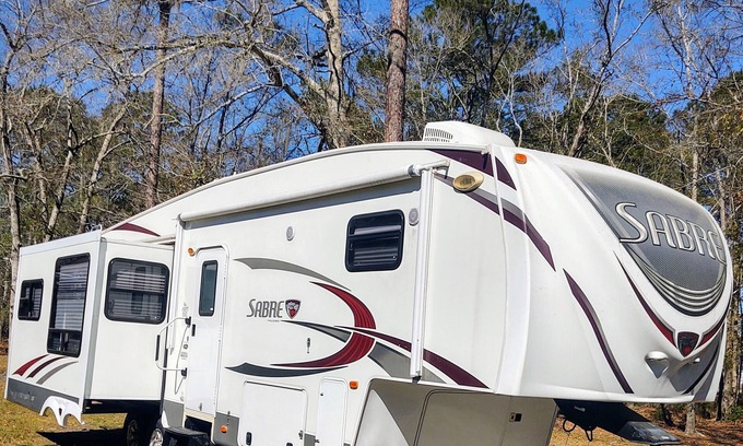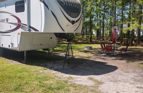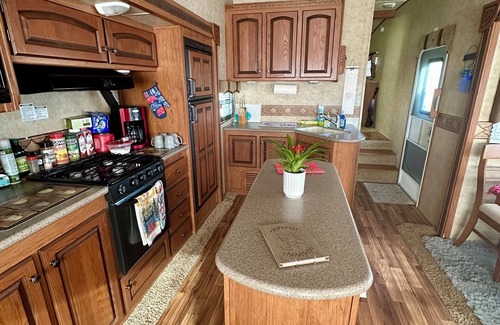 We have our RV for rent here at our home completely set up for you to enjoy. The only thing you should have to do is sit back and enjoy your stay. If your passing though the Savannah area and looking to spend some time here we have it set up in our serene backyard which has a fire pit, picnic table & grill for enjoyment. Our RV sleeps four people comfortably with lots of amenities for your comfort. The living area is quite spacious, there are two recliners and a couch that makes out into a double bed. There is a ceiling fan and electric fireplace if needed. The kitchen has a nice Island and cookware underneath, and a convection microwave and is well stocked for most all your needs w/plenty of counter space also. When you get ready to eat you can sit at the dining table which has 4 chairs for everyone. The outside of the camper has a nice awning and recently added outside lights in the back around the firepit patio area. The RV is self-contained with all utilities running off gas and electricity such as the gas stove and gas hot water heater. The RV also has two AC units to keep you cool, one in the living area which is vented throughout the whole RV and another AC unit in the bedroom for added cooling. There are also 2 TVs for your enjoyment, one in living room and another in the bedroom, and we have high speed internet for your convenience. If you prefer to listen to music there is a newly installed radio also in the living area which has all the features you should need. We strive to make your stay with us as comfortable and enjoyable as if you were part of our family!