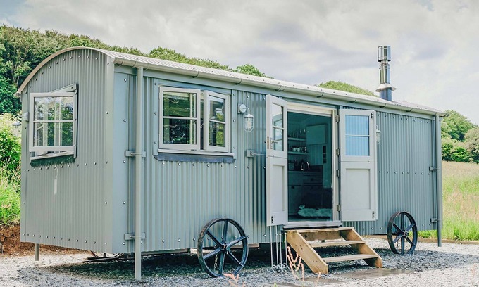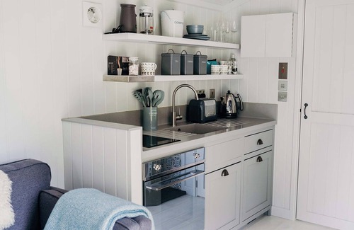 Shower Room: Cubicle Shower, Toilet. Electric central heating, electricity, bed linen, towels and Wi-Fi included. Welcome pack. Garden with sitting out area, firepit and barbecue. Wood-fired hot tub for 2 (private). Private parking for 2 cars. No smoking.. Nestling within a corner of its very own field, each of these three stunning Shepherd Huts is where two guests can truly relax and unwind in total peace, each in its own secluded setting. They have their own wonderful wood-fired hot tub, from which the views both by day and night are a sight to behold. The huts are furnished with great detail, care, and attention achieving a luxurious cosy feel. The properties are also winners of the ’Best Boutique Stay in Devon 2022’ award. Each hut has heating, plus a log burner inside, whilst there is a firepit which doubles as a barbecue outside.