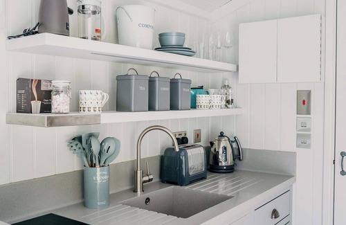 These large huts are cosy, warm, and very welcoming. With a wood burner creating a homely atmosphere, your cosy and inviting retreat has a sumptuous kingsize bed with crisp white linens and a comfy sofa. The smart kitchen has a ’Hotel Chocolat’ hot chocolate maker! On arrival at your hut, you can expect to find sachets of ’Hotel Chocolat’ hot chocolate drink, tea, coffee sugar, and a pint of milk. You can also relax and enjoy the complimentary scones, jam, and cream.