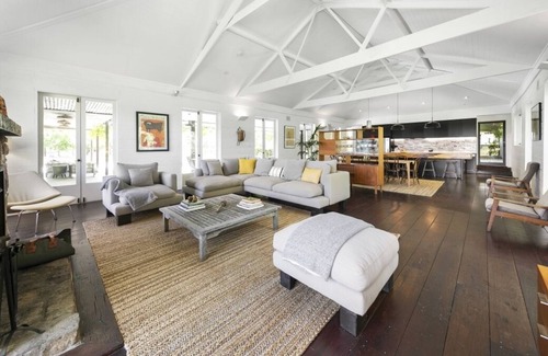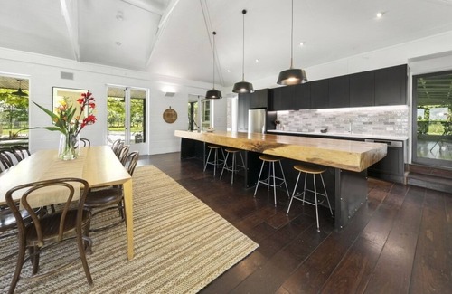 The dramatic and contemporary main living wing has vaulted cathedral ceilings and an ultra-modern kitchen with an incredible timber slab island bench. Gather friends and family around this epic bench for drinks, canapes and good times or sit at the Danish inspired dining table for a hearty breakfast or a gourmet dinner with locally sourced wines, baked goods and produce. This generous space has a sitting area with large picture windows to take in the rural views or, snuggle on the deeply comfortable lounge to watch a movie, read or tell stories over wine and cheese. The tall stone fireplace adds warmth to the room all year round. Six sets of French doors allow this space to flow on to shaded lush green lawn, garden, and gazebo on one side and to a leafy veranda, covered alfresco dining, BBQ and day beds surrounding the pool terrace on the other.