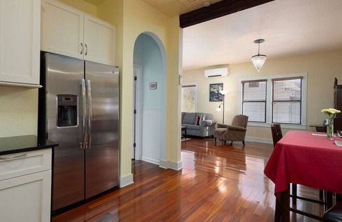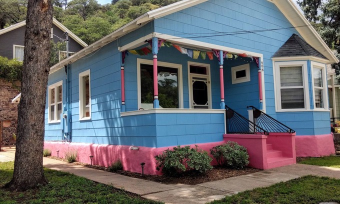 Minerva's Rest is a beautiful, luxurious, Victorian Era house in the unique town of Bisbee, Arizona. Built in 1905, the house features two bedrooms, a complete kitchen, one bathroom and a large open floor plan (and no cleaning fee). There are beautiful Brazilian Koa hardwood floors throughout the house, and each room has its own high efficiency wall mounted heating/cooling unit. The house is tastefully decorated with the work of our many local artists. Minerva's Rest also features beautiful outdoor spaces, off street covered parking, an EV charger, and none of Old Bisbee's famous stairs. A keyless entry lock allows guests a convenient self-check in. And, we offer discounts to active military, veterans, first responders, and law enforcement!