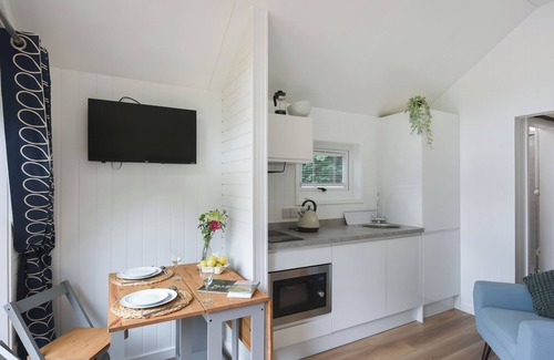 The brand-new self-contained Mini Lodge offers a quiet and comfortable stay for two guests hoping for an enjoyable and relaxing getaway. The modern bathroom features a lovely powerful shower. The open-plan kitchen and dining area are fully equipped for a comfortable stay, leading to a spacious and airy living area with patio doors opening onto a terrace, furnished for relaxation and enjoying the peaceful surroundings.