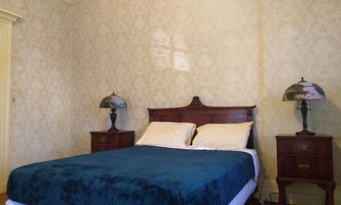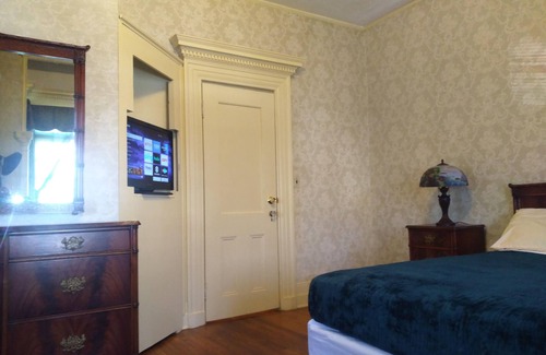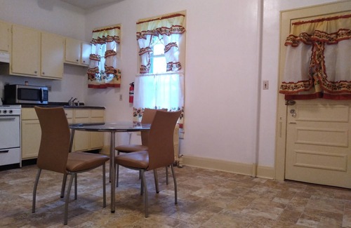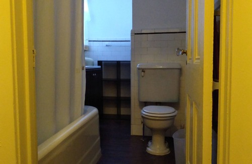 This mini mansion has a total of six apartments. I am using one of the two bedroom apartments as a short term rental. Each room has it's own unique style and characteristics, definitely one of a kind. Room one has high ceilings, Victorian crown moldings, a large window seat and a double winding princes windows and Two stain glass windows. Large round walk in closet, with a unique round door and hardwood floors. Room two has it own unique style, as well. Hardwood floors, three large windows, two closet, one large, one small and a lovely French glass panel door, that leads to a front balcony, with a view of other mansion in the area. A large eat in kitchen/siting area, with a futon. One large bathroom, with vanity sink mirror and a tub shower combo.