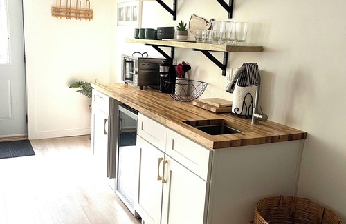 Kitchenette includes air fryer/toaster oven and mini fridge as well as all needed utensils, dishes and glasses to feel at home.