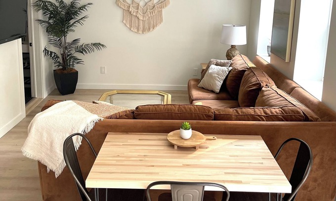 Queen size hybrid Murphy Bed for sleep and a sectional sofa living room space to unwind. All sheets, blankets, pillows and towels included.