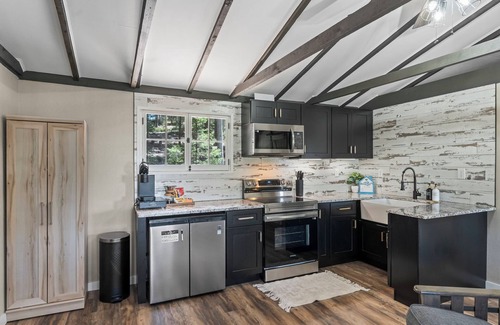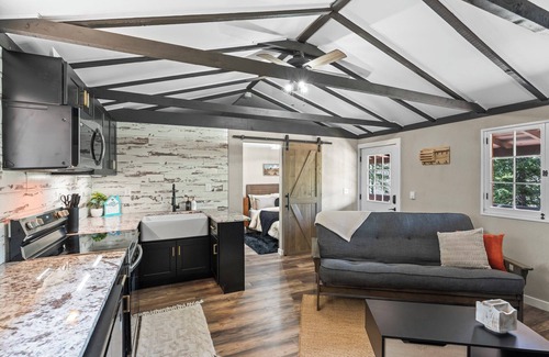 Inside, the living room provides a cozy atmosphere with an electric fireplace, a Somette Tucson futon, and a dining table ideal for two. For entertainment, enjoy a selection of games, books, and a 42" Smart Fire TV. The bedroom features a 10-inch Green Tea Memory Foam Queen-Size Mattress and blackout shades, ensuring a restful and rejuvenating night’s sleep.