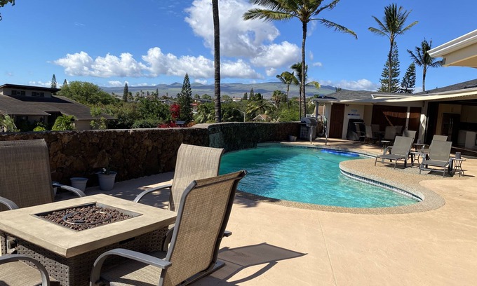 Perfect Hawaiian vacation home. Watch the best sunset views every night and then star gaze by the fire pit. During the day relax by the pool on the large lanai. Great for grilling as the family takes a swim. Solar-heated, salt water pool and lanai are surrounded by a lava rock wall that makes for secluded private gatherings. Unique indoor outdoor living as the great room, dining room, and kitchen open up to the lanai. Leave doors open for the famous Waikoloa breezes. 2 master bedrooms each with private bathroom. One master has a king bed. The second master has a king and queen, perfect for family. Both rooms open to the pool deck. Wake up to views of the ocean and mountains then take a15 minute ride with beach accessories and enjoy paradise at Hapuna Beach.