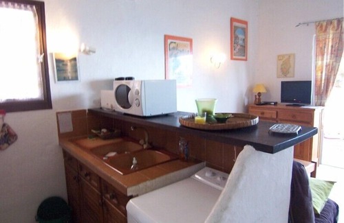 Living room / kitchen: sofa bed (slats 2 people), TV, fridge / freezer, stove, oven (gas), extractor hood, microwave, washing machine, coffee maker, iron and ironing board