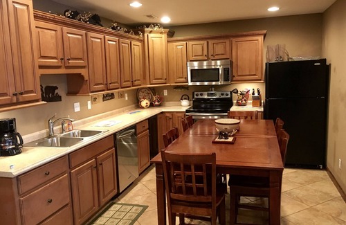 The third floor features the second full kitchen with pub seating, 2 tables for 4. BONUS- ICE MACHINE. There are 3 bedrooms on this level, 2 King and another room with 2 sets of full size bunk beds. 2 of the bedrooms walk out on to the deck. The entertainment area features the third big screen TV, X Box 360, surround sound, and a pool/air hockey table. The covered deck on this level has a 8 person lighted hot tub and additional seating. Additional laundry room.