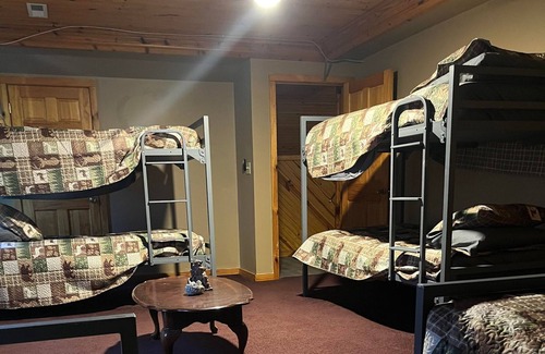 This short-term cabin rental may sleep up to 21 people. In addition to 3 bedrooms and 2 baths has a dormitory style room with 5 bunk beds, 2 full baths and a full-size Kitchen. It is ideal for large families and or groups in search of a weekend in the woods of Kentucky. It's also ideal for a couple that wants a secluded weekend retreat. It is at the end of a gravel drive that is .2 of a mile off the road and sits on 30 acres of wooded hillside and is heavily populated with deer. It is 30 minutes away from Mammoth Cave, the Corvette Museum, Lost River Cave and more. Graham Central Station antique shop, located in Morgantown is one of my favorites. We also have 2 fire pits at the cabin.