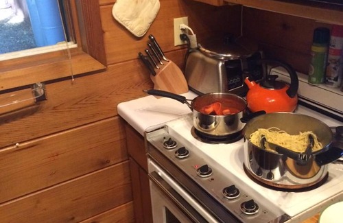 But there's a kitchen and an excellent newer Weber gas bbq at the cabin, all the utensils and quality pots and pans and even some spices and such, and it's really quite nice here, so it's entirely possible you won't feel like leaving once you get here. Just stay put and cook! Enjoy the sunset. Go to bed early... or drink wine out on the screen porch... whatever ;)