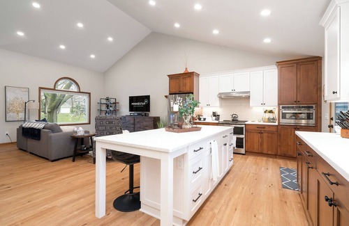 You'll love cooking in this kitchen which features a dual oven, a high tech microwave, stainless steel appliances, and a large farmhouse sink that overlooks the creek. The kitchen island has four comfortable bar stools and ample space for cooking or serving dishes. Take a few steps down to the sunken living room and cozy up by the fireplace with a good book. And don’t forget to check out the vast DVD collection! Exit the sliding glass doors and find yourself just steps from Purgatory Creek. Grill up some steak on the deck or toast marshmallows over the firepit, all while enjoying the beautiful sounds of nature.