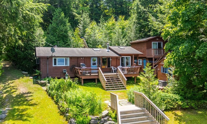 Gorgeous Bob Lake Waterfront and property. Just a 5 min drive to the charming town of Minden. Drive through gorgeous forest to this 2 bedroom, 1 bathroom "Old-English style" family-oriented cottage with separate bunkie and separate loft out-buildings for a total of 4 bedrooms plus an outdoor sauna. Beautiful waterfront - ideal for swimming, boating, and days in the sun. Sleeps 10 plus a pullout couch and futon. Includes kayaks and canoe.