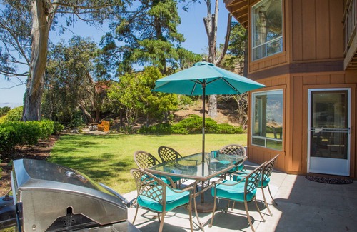 This spacious home includes 2 kings, 3 queens, 3 twin trundles(6 twins)and a queen sleeper sofa in the recreation room. The large generously equipped kitchen with center island, jenn aire stove and double oven provides plenty of room for the whole family to share in preparing meals. You will enjoy ocean views while cooking or sitting at the large kitchen table seating 8. The kitchen is open to the den, as well as close proximity to the large stainless steel barbeque on the back patio just steps out the kitchen door. One of the finest coastal views can be found in the private backyard, where the patio is the perfect place to relax, enjoy a drink and take in the beautiful views of Morro Bay and the ocean. The comfortable patio set has enough seating for eight.