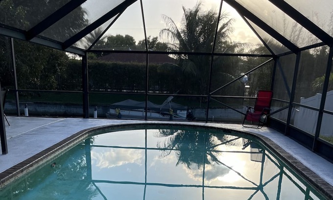 Forget your worries in this spacious and serene space. This property offers a pool and a canal. Enjoy fishing off our private dock, fully stocked kitchen and linens provided. We are minutes away from restaurants and shopping.