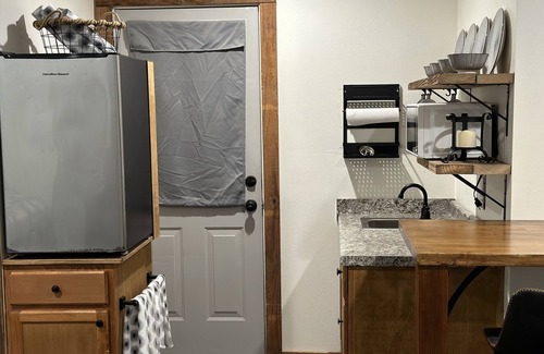 Minutes from the interstate, The Barn allows you to get away and enjoy the peace and quiet of nature. This new addition combines modern amenities and rustic charm. As you pull on to our road The Barn is to the left of our home. You can enjoy watching the smart TV that swivels between the living area and the bedroom, take a nap on the sleeper sofa, or get a peaceful night's sleep in the California king bed. There is a huge walk in closet which will accommodate a pack-n-play that is available for use. The kitchenette has a microwave, airfryer/toaster, hotplate, a Keurig and refrigerator. Plates, cups, utensils, and cookware are provided. Outdoors a charcoal grill and a fire pit are available for use. Charcoal, lighter fluid, and a lighter are provided along with a bundle of wood. Feel free to roam around where we raise rabbits, ducks, and chickens. We often see deer wandering behind the pond. Come relax in the cozy indoors, soak up fresh air on the porch or hike around the property. We look forward to having you as our guest!