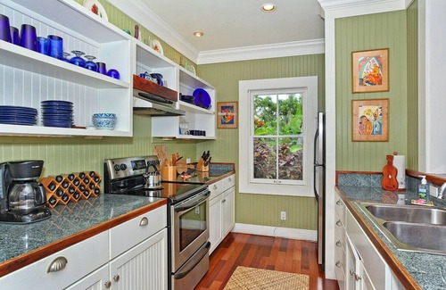 The furnishings are comfortable and upgraded with a plush leather couch and chair. We have designed the cottage with warm tropical colors, original local artwork, Hawaiian antiques and Polynesian exotica. Though the house has a tasteful and elegant décor, you can still put your feet on the furniture and enjoy the relaxed atmosphere. You will arrive to rooms filled with brilliant tropical flowers and orchids, 100% cotton, high thread count, quality linens and towels and quality soaps as well as coffee and green tea to start off your first day with us – fine details on par with the finest luxury hotel at a fraction of comparable prices.