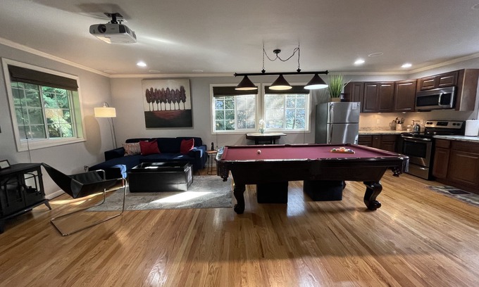 Your car will be secured inside the fully fence yard in the private parking spot in front of the Carriage House garage door. The covered patio to the right of the house will lead you to the secured side entrance door into the finished garage. Once inside, the stairs will guide you to the second level studio apartment where upon entry, the large windows open up to the humongous evergreens and maples that surround the Carriage House, making it feel like you're relaxing in a treehouse while enjoying all the comforts of home; full kitchen that is fully stocked, regulation sized pool table, HUGE drop down projector screen TV, comfy queen Murphy bed and couch that folds into a spacious king bed, soft linens, lovely bathroom with shower, Keurig and coffee pods, covered deck with large L-shaped couch to lounge on with a morning cup of joe or evening glass of wine...firepit and S'more's anyone? Here for work? No problem! Enjoy the pub style table that expands for plenty of work space and YES! We have very reliable, highspeed Wifi! We are here to make your stay in Woodinville most enjoyable.