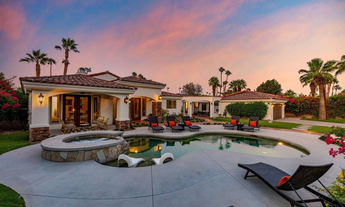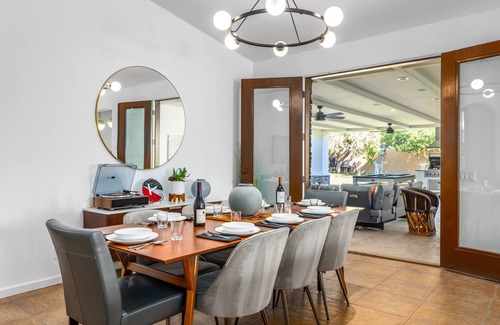 Mirador Desert Oasis is the perfect Mediterranean resort-style home for your next luxurious vacation in Palm Springs. The front and back yards deliver Rivera resort-style opulence and unobstructed views of the surrounding palm trees and mountains. The pool and spa are where guests can relax and cool off, and the ping pong and pool tables are where champions are made. Multiple seating areas provide plenty of space for relaxing together or catching a moment alone, and the BBQ grill and outdoor dining area are ideal for al fresco feasts. Beds: K,K,Q,F/F.
